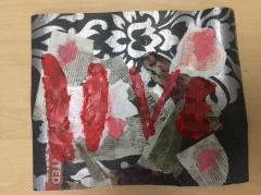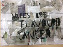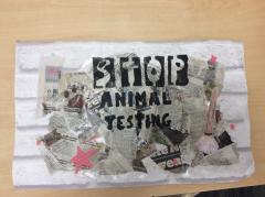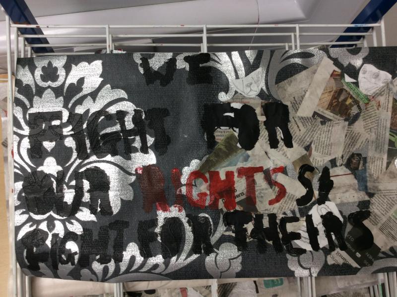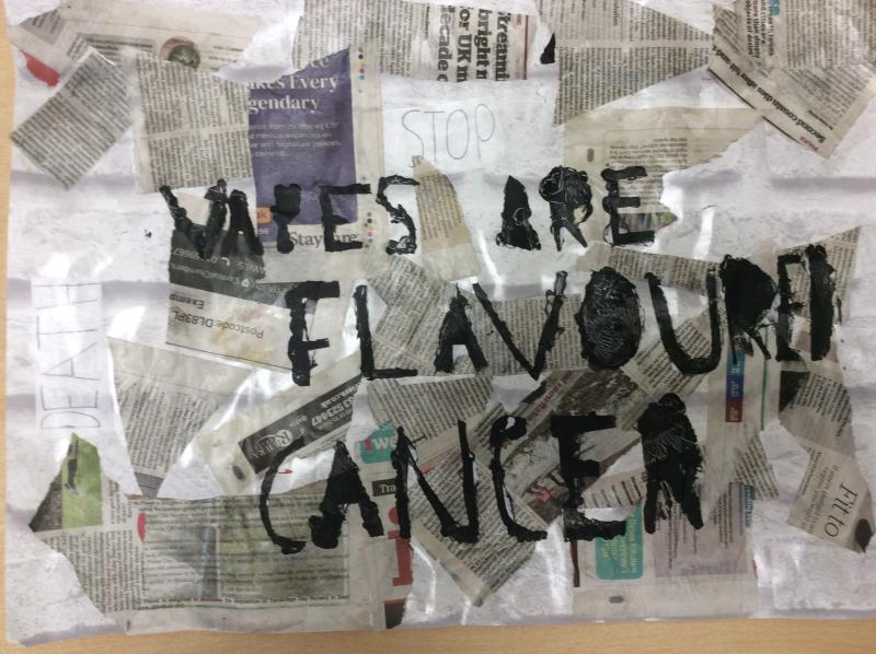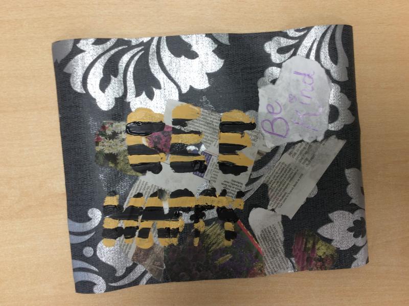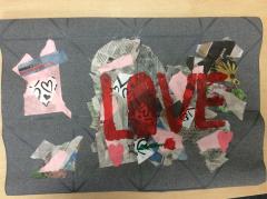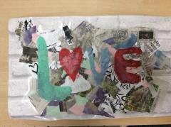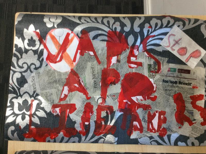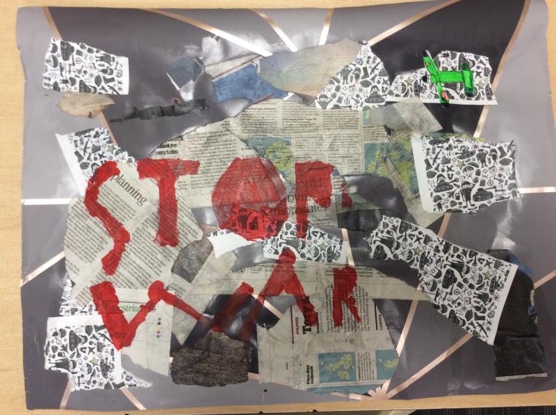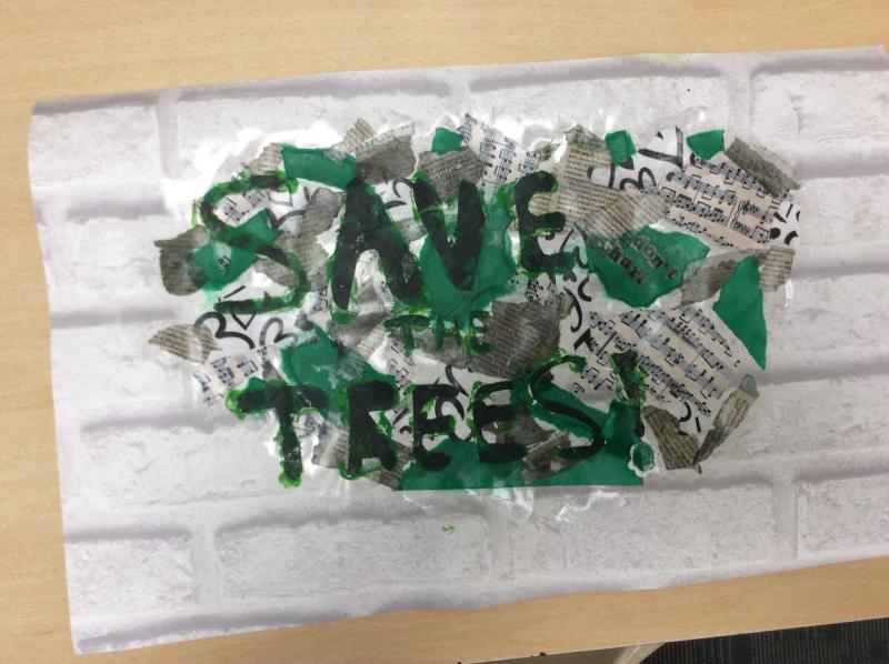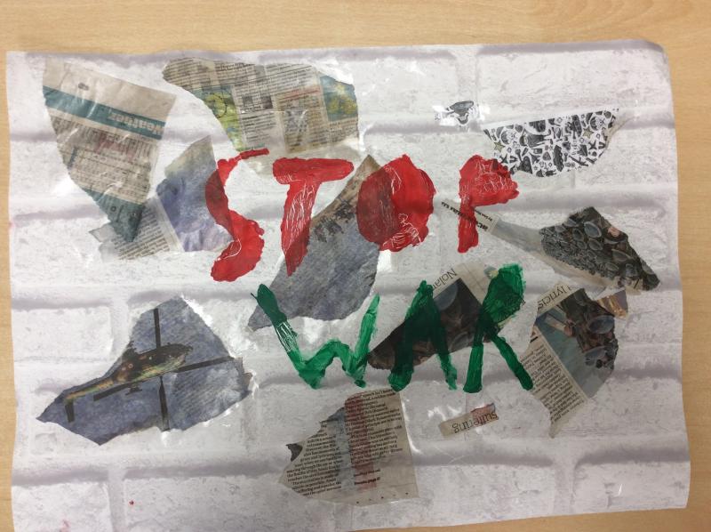 The children working very hard to make their own stencils of their chosen message and then we used acrylic paint to paint these onto the backgrounds we made last week.