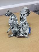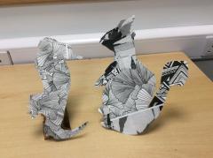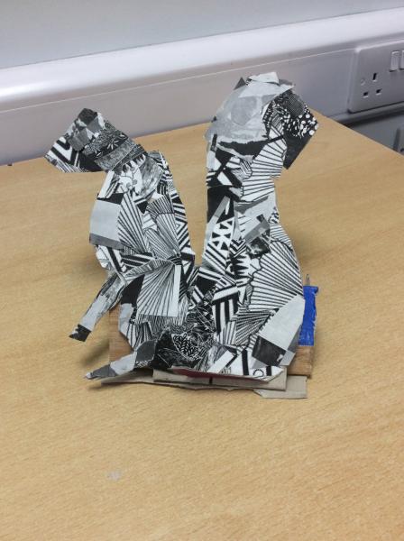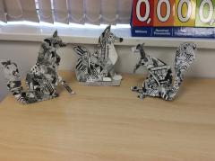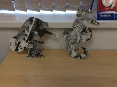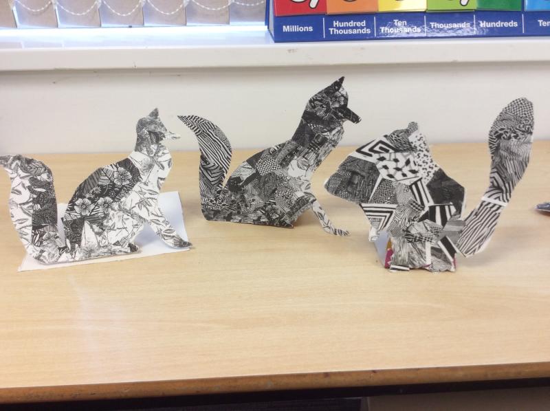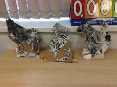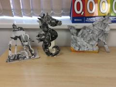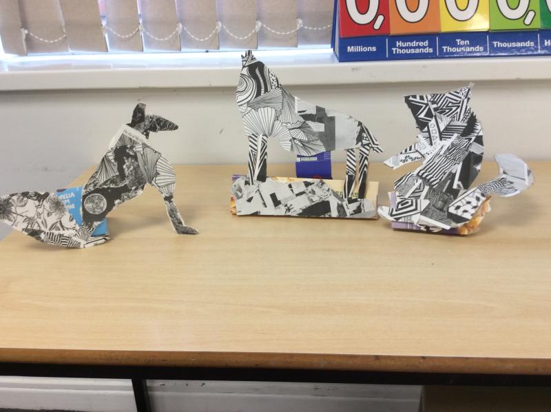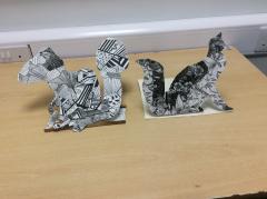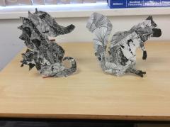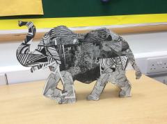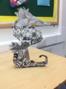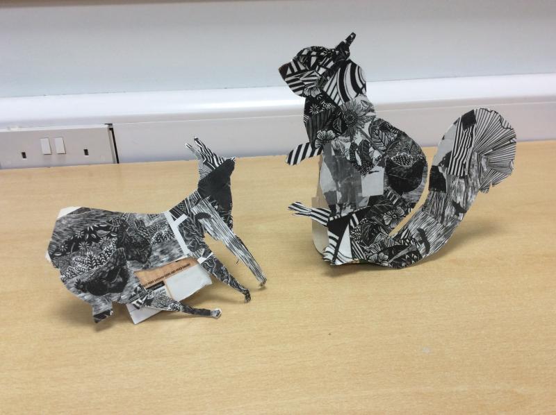Today, we completed our art project on 2D drawing to 3D making. We turned our 2D animal sketches into 3D models which can stand up independently. We used collage papers to add tone to the artwork.