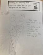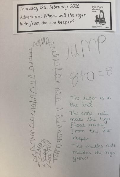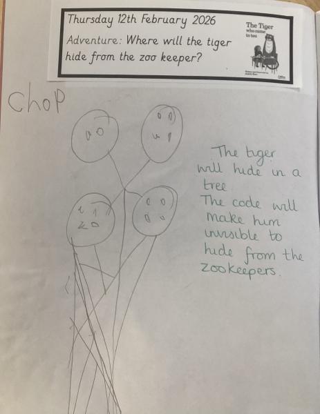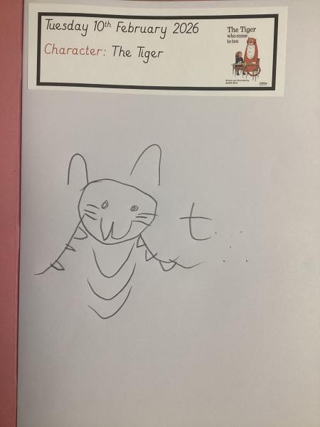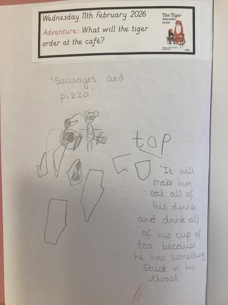 We have been reading 'The Tiger Who Came to Tea' as part of our Drawing Club this week. We enjoyed learning new words such as 'arrived' and 'feast'. The children had to imagine what the hungry tiger would order from the cafe and where he would hide from the sneaky zookeepers. We are focusing on describing a picture and writing simple codes using phonics knowledge.